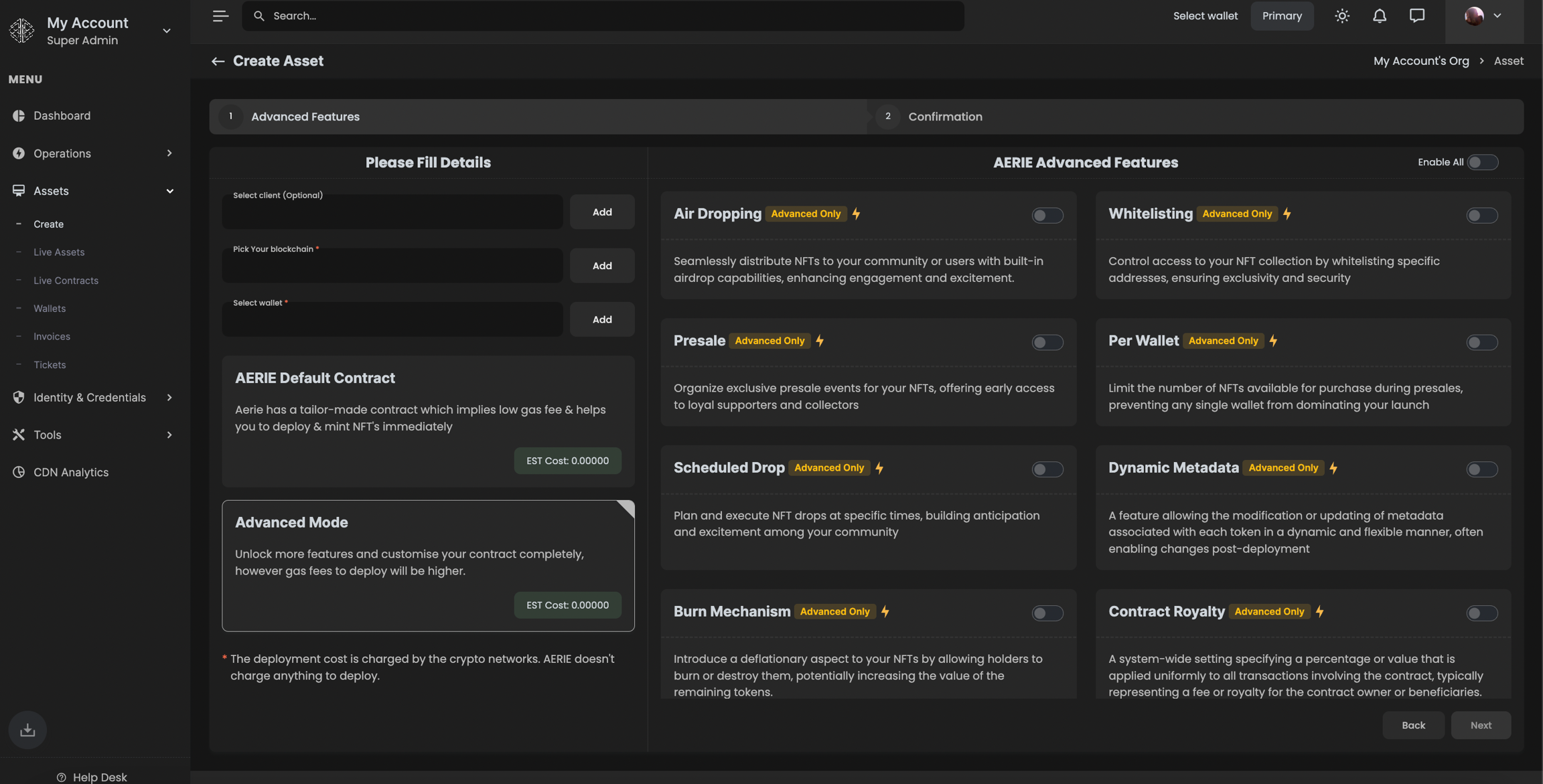 Default Contract Mode: Ideal for quick and low-fee deployments, this mode offers a ready-to-use contract with essential features.